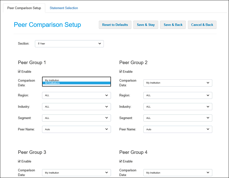 1. The Section field determines the number of years of information to use for data points in comparisons with all peer groups. The standard default setting is 5 Year. System administrators can change the default value using the Section field on the Peer Comparison Setup defaults page. Other options are 3 Year, 7 Year, 10 Year, and ALL. The ALL option uses all years of available information for data points in comparisons with all peer groups.