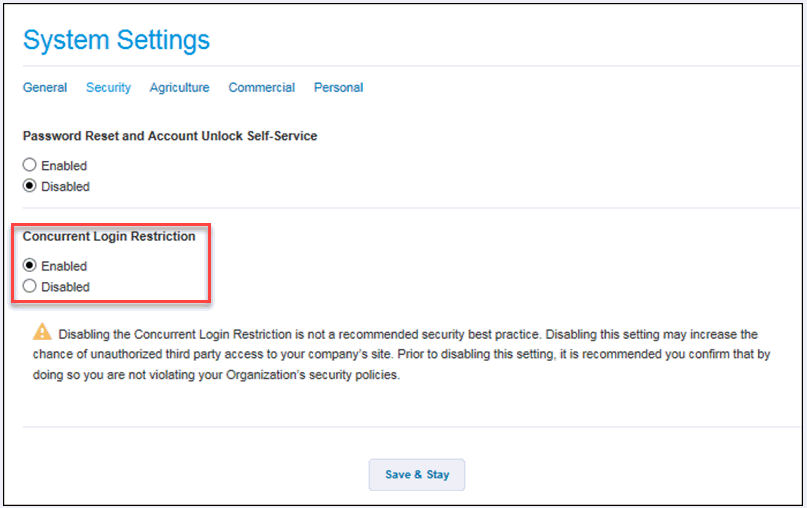 Warning! Disabling the Concurrent Login Restriction is not a recommended security best practice. Disabling the restriction might increase the chance of unauthorized third-party access to your company's site. Prior to disabling the restriction, it is recommended you confirm that by doing so you are not violating your organization's security policies.
