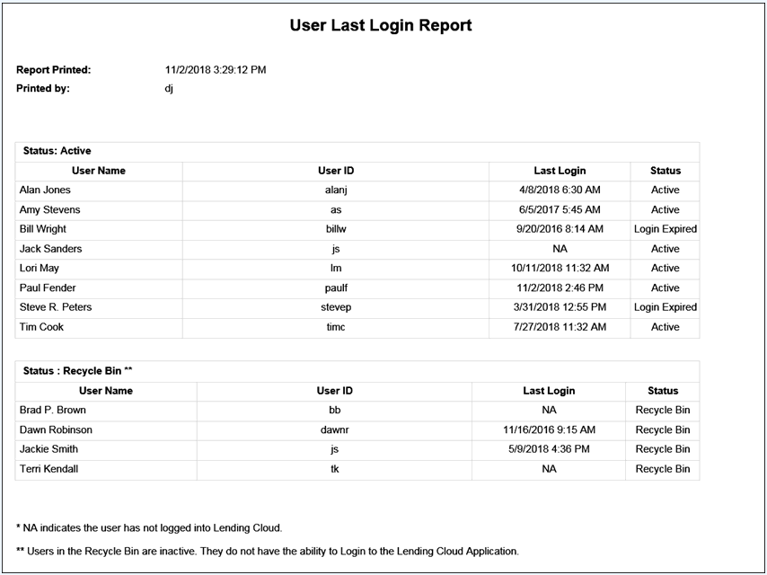 The User Last Login Report displays the date (Month/Day/Year) and time (Hour/Minute/Second/AM or PM) that the report was printed. It also displays the Lending Cloud User ID of the user who printed the report. The report contains two sections. The Active section is followed by the Recycle Bin section.