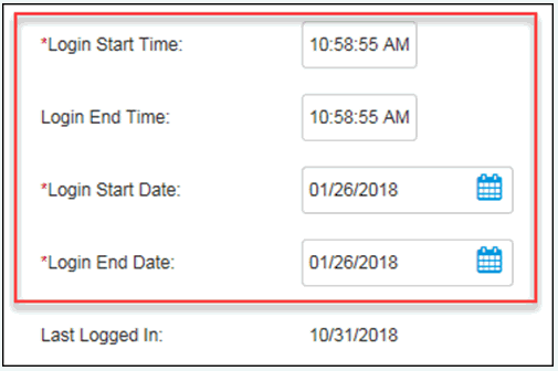 When a new user record is established in Lending Cloud, the Login Start Time and Date and the Login End Time and Date in User Management both match the time and date the record is first saved, unless a system administrator over-writes the values. The identical login start time/date and login end time/date indicate that the user record is active and the login period has no end. The following illustration provides an example of the login start and end information for these users: